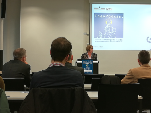 Am 22. Januar ist der TheoPodcast, ein Podcast der Katholisch-Theologischen Fakultät der WWU online gegangen. Das Go-Live wurde feierlich begangen. Institutsdirektorin Prof´in Dr. Marianne Heimbach-Steins hat die Veranstaltung moderiert in ihrer Aufgabe als Prodekanin für Internationalisierung, Forschung und wissenschaftlichen Nachwuchs; man wolle "auf zeitgemäße Weise zum Wissenstransfer beitragen".