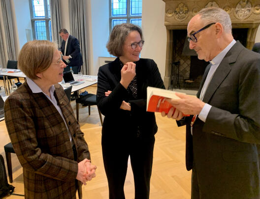 Prof.'in Dr. Michelle Becka, Sprecherin der Arbeitsgemeinschaft Christliche Sozialethik (AG CSE), moderierte das Gespräch am Abend, in dem es vor allem um die Klimakrise und die weltweite Gefährdung der Demokratie als „Zeichen der Zeit“ ging. Im Verlauf des Abends übergaben Marianne Heimbach-Steins und Michelle Becka das von ihnen mitherausgegebene Lehrbuch zur Christlichen Sozialethik (2022) an Kardinal Czerny.