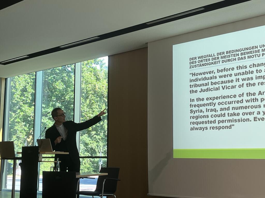Der extra aus Rom angereiste Prof. Dr. Nikolaus Schöch OFM hielt den Festvortrag mit dem Titel „Der Ort, an dem die meisten Beweise tatsächlich zu erheben sind als Zuständigkeitsgrund gemäß can. 1672, Nr. 3 MIDI“. Pater Schöch, der an der Apostolischen Signatur in Rom tätig ist, konnte dabei anhand zahlreicher Beispiele einige Einblicke in die Probleme der Praxis geben.