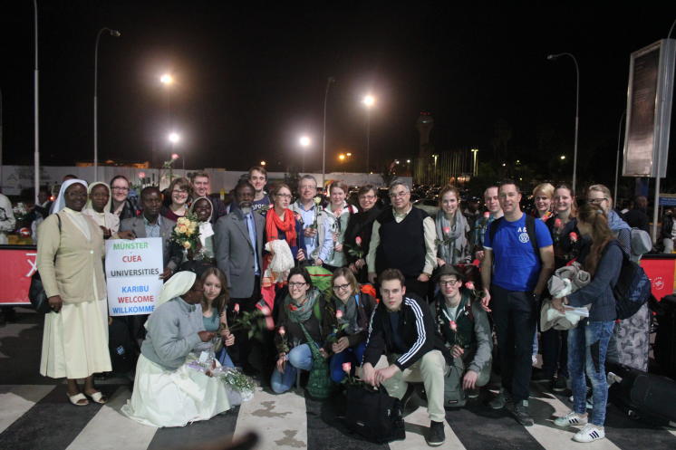 Am sechsten März gegen 21 Uhr kenianischer Ortszeit ist es endlich soweit: unsere Reisegruppe betritt auf dem Flughafen Jomo Kenyatta in Nairobi das erste Mal kenianischen Boden. Nach einem neunstündigen Flug, Pass- und Ebolakontrolle, werden wir herzlich durch unsere Gastgeber, die Franziskaner Schwestern, mit Rosen und afrikanischen Gesängen begrüßt und von einer kleinen Delegation der CUEA (Catholic University of Eastern Africa) in Empfang genommen.