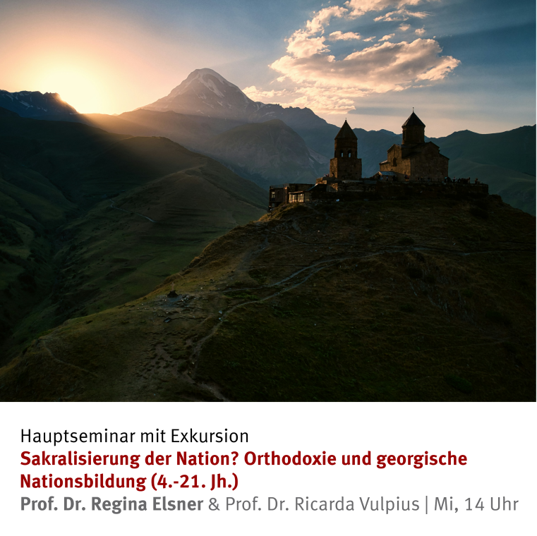 Ein besonderes Highlight des Semesters bildet in Kooperation mit der Abteilung für Osteuropäische Geschichte veranstaltete das Hauptseminar zur Georgischen Orthodoxen Kirche mit Exkursion nach Georgien. Die Georgische Kirche zählt zu den ältesten christlichen Traditionen und prägt bis heute maßgeblich die nationale Identität des Landes. Das Seminar beleuchtet ihre Rolle in der postsowjetischen Transformation ebenso wie ihre theologischen Besonderheiten; die Reise ermöglicht vertiefte Einblicke in kirchliches, kulturelles und gesellschaftliches Leben vor Ort.