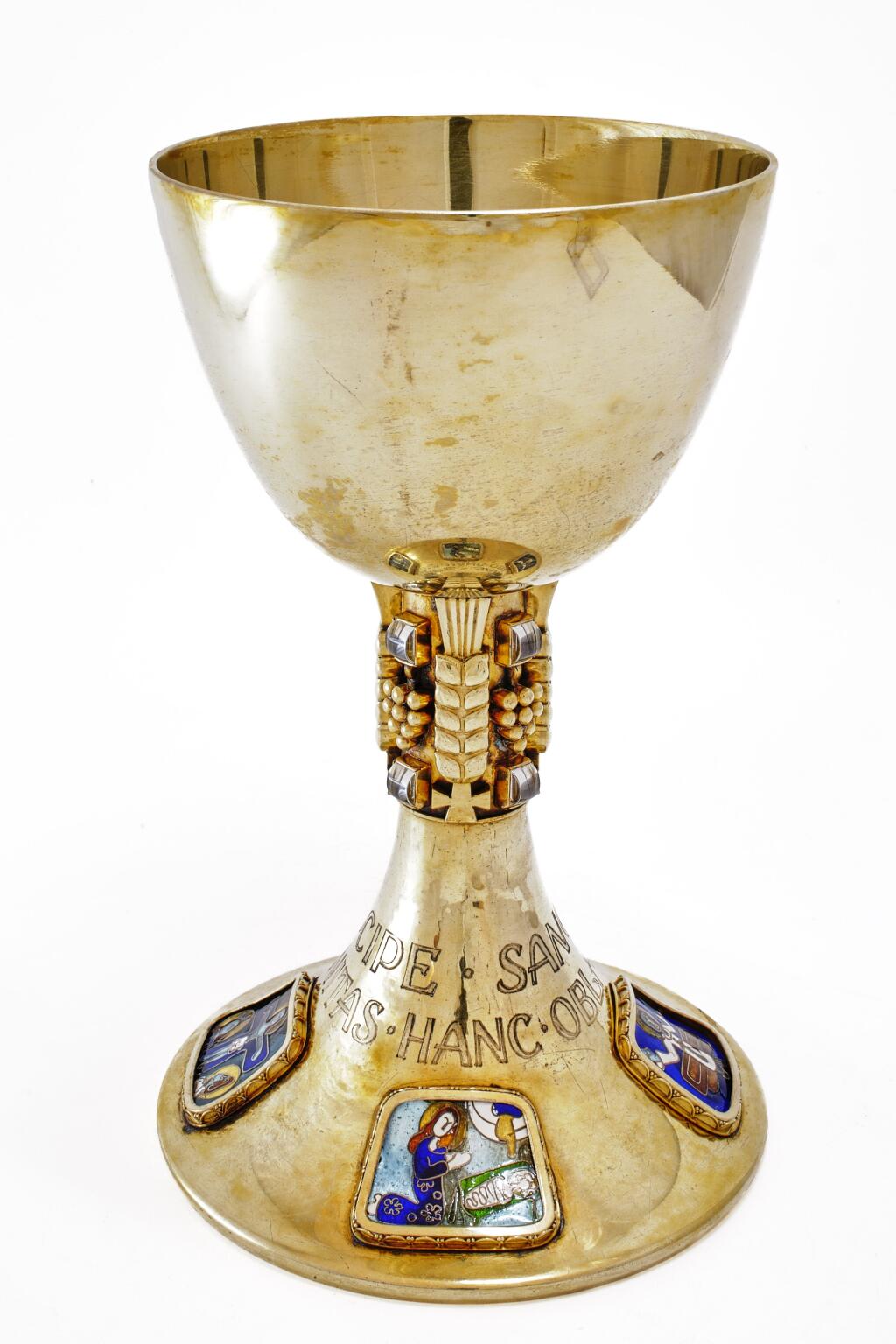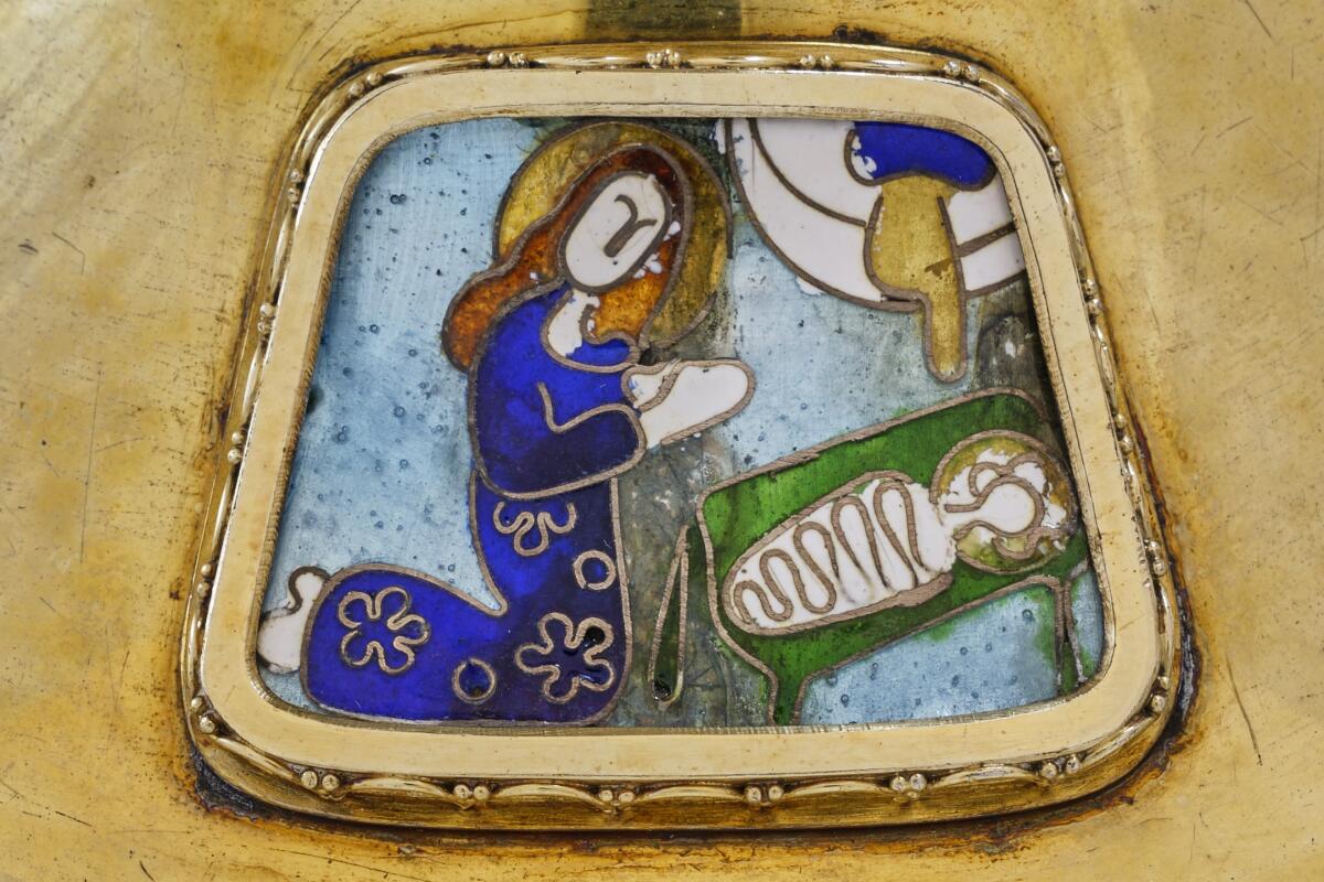 Dieses kleine Medaillon in Zellenschmelztechnik hat unsere Inventarisatorin Sabine Klingelhöffer auf dem Kelch des 1922 geweihten Pastors Franziskus Rensing entdeckt. Er war der erste Pfarrer der Dreifaltigkeitskirche in Münster nach dem 2. Weltkrieg. Das Medaillon stellt in ungewöhnlicher Weise die Geburt Christi dar. Ganz ohne Josef, die Hände Mariens im Mittelpunkt. Der Kelch trägt die Umschrift „SUSCIPE SANCTA TRINITAS HANC OBLATIONEM“. Mit der auf das Christuskind weisenden Hand Gottes und dem Wort „HANC“ (dieses) direkt über dem Medaillon unterstreicht die Darstellung die Tragweite der Menschwerdung, der Geburt Jesu als Sohn Gottes.