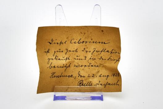 Der Künstler hat hier sehr eindrücklich die in den 60er und 70er Jahren sehr präsente Idee umgesetzt, dass die Kirche das Volk Gottes auf dem Weg ist. Kirchen wurden in dieser Zeit nicht selten in der Form eines Zeltes gebaut. Custodien bzw. Monstranzen in der Form eines Zeltes sind sehr selten.