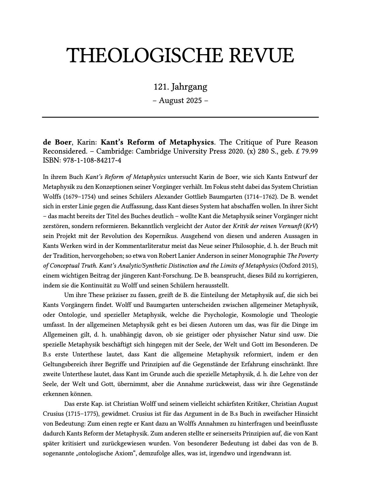 Rezension: Kant’s Reform of Metaphysics. The Critique of Pure Reason Reconsidered