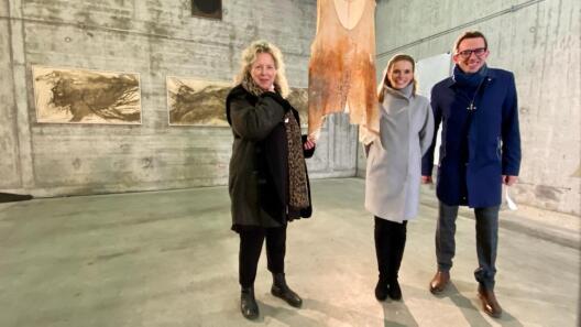 Etwa 50 geladene Gäste begrüßte Prof. Norbert Köster als Leiter der Arbeitsstelle für Christliche Bildtheorie. Nach dem Geleitwort von Prof.in Astrid Reuter, Prodekanin der Katholisch-Theologischen Fakultät der WWU Münster, stellten die Kurator*innen Carolin Hemsing und Ludger Hiepel das Ausstellungskonzept vor und ließen die Künstlerin anschließend feierlich das Bunkertor an der schweren Kette für die Besucher*innen öffnen.
