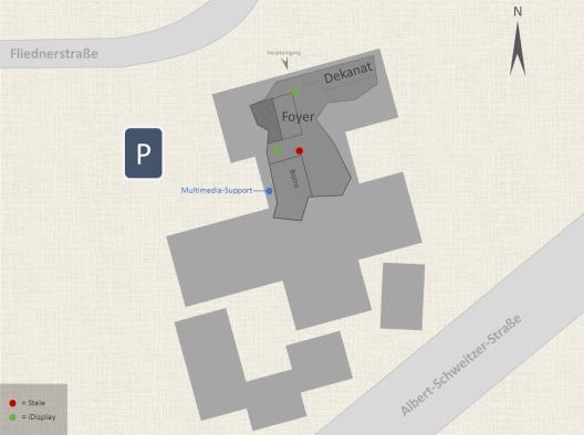 Für einen Überblick, wo genau die Standorte der Fachbereichs-Displays in der Fliednerstraße sich befinden, kann das Bild rechts durch klicken vergrößtert werden. Grün = iDisplay; rot = Digitale Stele.
