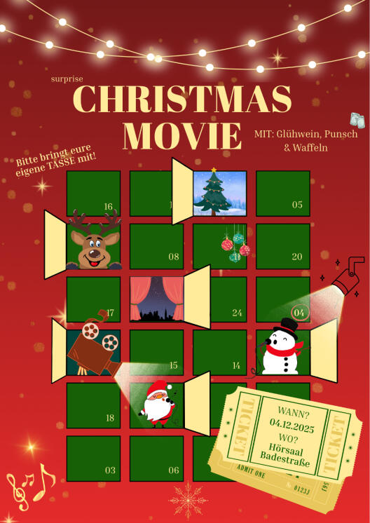 am Donnerstag den 04.12. schauen wir wie jedes Jahr gemeinsam einen Weihnachtsfilm 🎥🎄. Wir freuen uns auf einen gemütlichen Abend mit euch bei Waffeln, Punsch und Glühwein 🧇🍿