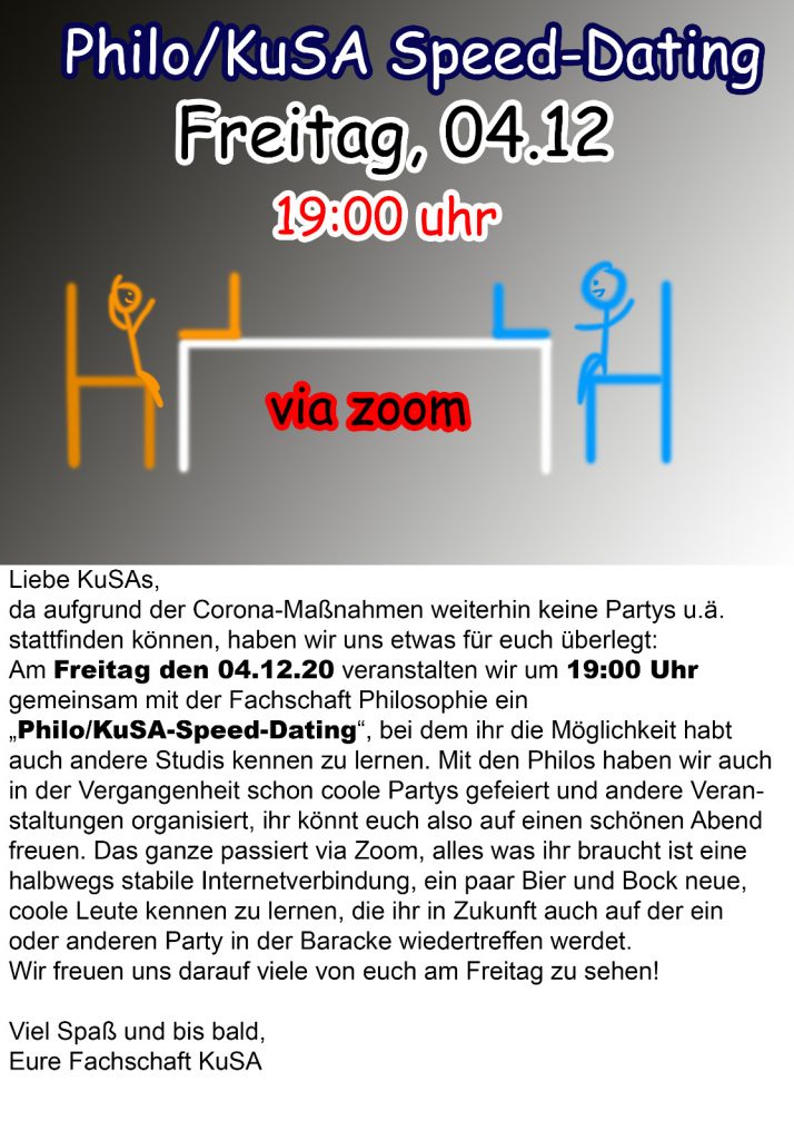 Liebe KuSA-Erstis und höhere Semester, Wir haben uns mit unseren guten Freund*innen aus der Philo zusammengesetzt und festgestellt, dass es längst mal wieder Zeit wird für eine gemeinsame Veranstaltung! Wer es aus der Vergangenheit nicht kennt, die Fachschaften haben üblicherweise die jährliche Fachbereichs-Verschmelzungs-Party, das Sommerfest oder andere schöne Feiern gemeinsam organisiert. Höchste Zeit, unser Bündnis wieder aufleben zu lassen, dachten wir uns. Natürlich sind unsere Möglichkeiten dieses Mal aufgrund der Pandemie etwas eingeschränkt. Aber das soll unserer Fähigkeit, für alles eine kreative Lösung zu finden, natürlich nicht im Wege stehen. Deshalb präsentieren wir euch heute: