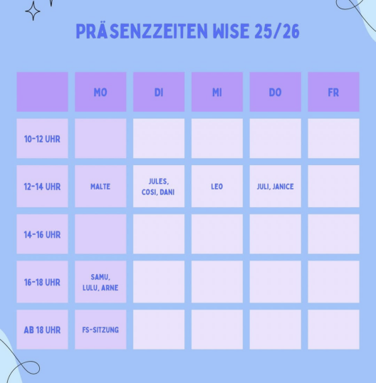 Wir bieten Präsenzdienste in unserem Fachschaftsraum im Keller des Bispinghofs (Gebäude A) an. Gerne könnt ihr dorthin kommen, um mit uns Fragen zu klären oder Anliegen zu besprechen. Zu welchen Zeiten ihr im Laufe der Woche welche Fachschaftsmitglieder im Raum antreffen könnt, könnt ihr dem weiter unten beigefügten Plan entnehmen.