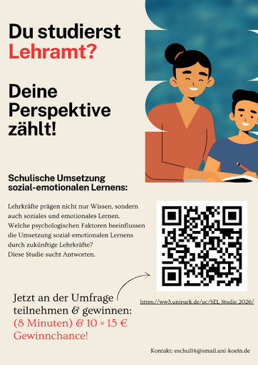 So können beispielsweise Umfragen (zur Teilnahme an Erhebungen im Zusammenhang mit Bachelor- oder Masterarbeiten sowie zu Promotionsvorhaben, im universitären Kontext etc.) nur dann veröffentlicht werden, wenn diese einen direkten Bezug zum Lehramtsstudium haben. Eine Weiterleitung von Links zur Teilnahme an Umfragen über E-Mail-Verteiler ist uns grundsätzlich nicht gestattet. Jobangebote sowie Informationsveranstaltungen werden ebenfalls nur dann veröffentlicht, wenn sie einen direkten Bezug zum Lehramtsstudium bzw. einen sozialen Hintergrund aufweisen und keine gewerblichen Interessen sowie keine politisch orientierte Motive erwarten lassen. Informationen und Stellenanzeigen, die uns mit der Bitte um Veröffentlichung zugesandt werden und den genannten Bedingungen nicht entsprechen, können leider keine Berücksichtigung finden und werden nicht beantwortet – wir bitten darum, von diesen Anfragen abzusehen. Herzlichen Dank für das Verständnis!