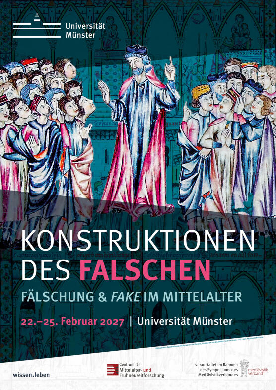 Unter dem Titel „Konstruktionen des Falschen: Fälschung und Fake im Mittelalter“ werden im Rahmen des 21. Symposiums des Mediävistikverbands vom 22. bis zum 25. Februar 2027 an der Universität Münster die Phänomene Falschheit, Fälschung und fake in interdisziplinärem Zugriff erkundet. Ausrichter der Veranstaltung ist das Centrum für Mittelalter- und Frühneuzeitforschung der Universität Münster.