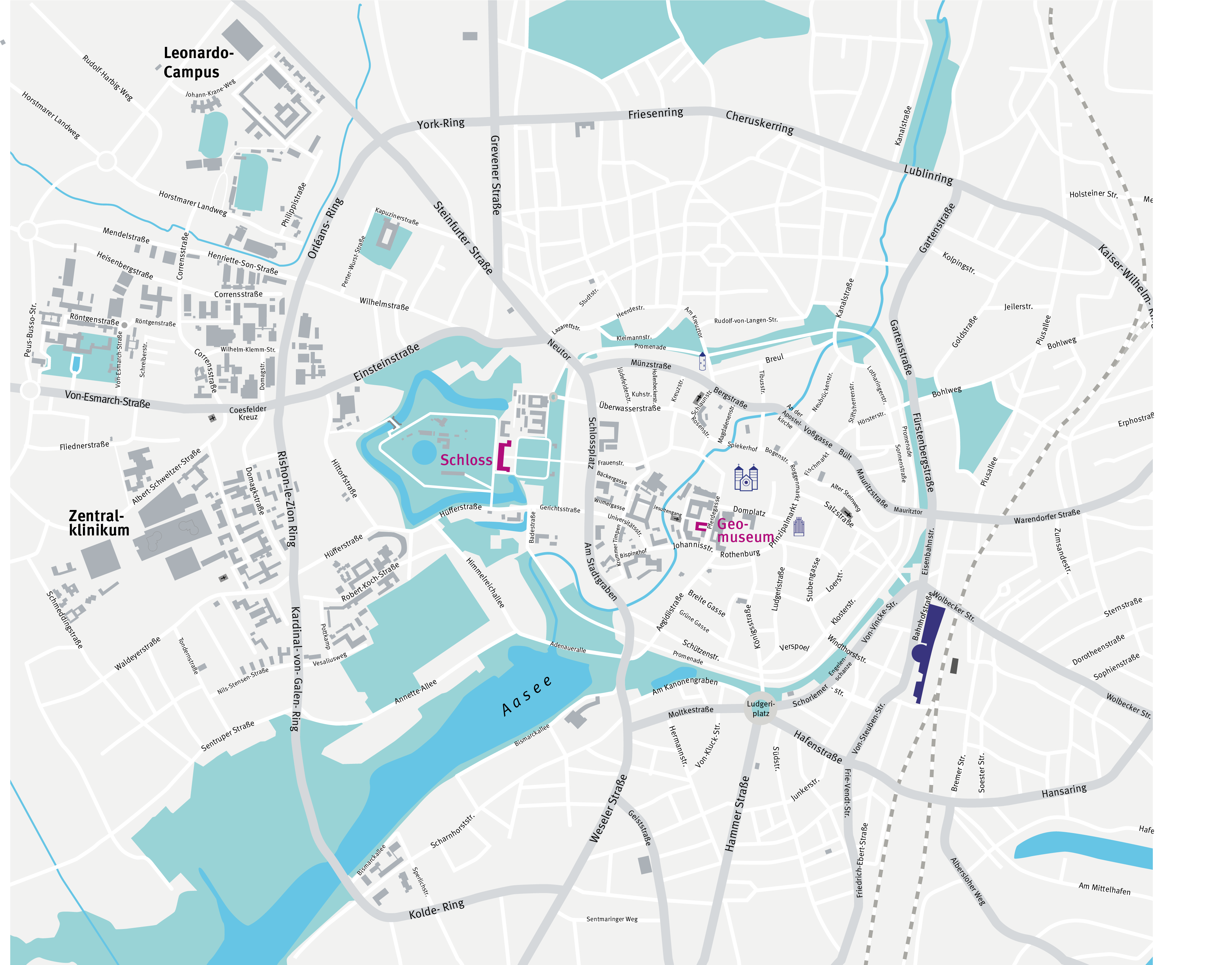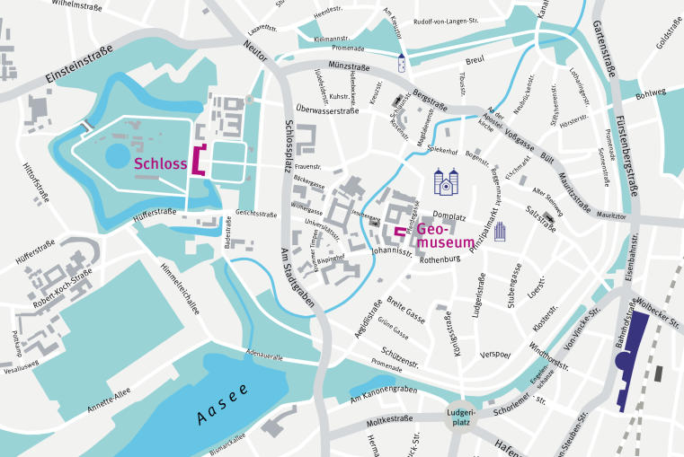 Übersichtskarte© Uni MSSchloss Münster | Schlossplatz 2© Stefan Klatt 1. OG Aula, S2, S8, S9 EG S1 >> Ausgang Geomuseum | Pferdegasse 3© Uni MS | Christoph Steinweg