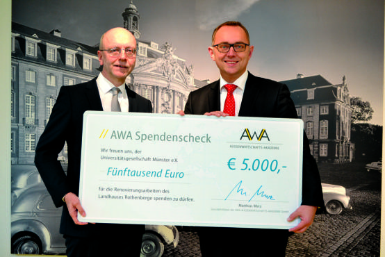Mit einer Spende in Höhe von 5000 Euro unterstützt die Außenwirtschafts-Akademie (AWA) die Sanierung des Landhauses Rothenberge – Seminarstätte für die Westfälische Wilhelms-Universität Münster (WWU). Den Scheck überreichte AWA-Geschäftsführer Matthias Merz an Dr. Paul-Josef Patt, Vorstandsvorsitzender der Universitätsgesellschaft Münster e.V. Mit dem Geld werden Umbau und Renovierung unterstützt. Das in Wettringen (Kreis Steinfurt) gelegene Landhaus wird seit mehr als 50 Jahren von der Universitätsgesellschaft als Weiterbildungsstandort unterhalten.