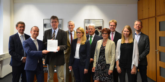 Aus Mitteln der Denkmalförderung des Landes Nordrhein-Westfalen hat heute (17. Juni) Abteilungsleiter Ralf Weidmann einen Förderbescheid über 30.000 Euro für die Sanierung und Restaurierung der denkmalgeschützten Innenausstattung der Villa Rothenberge in Wettringen an den Geschäftsführer der Bertha-Jordan-van-Heek-Stiftung, Franz-Josef Melis, den Vorsitzenden des Stiftungsvorstands, Jan Bernard van Heek, Prof. Hans-Michael Wolffgang von der Universität Münster, Christoph Wäsker von der Universitätsgesellschaft Münster sowie Architektin Andrea Piehl vom Büro Pfeiffer Ellermann und Preckel überreicht.