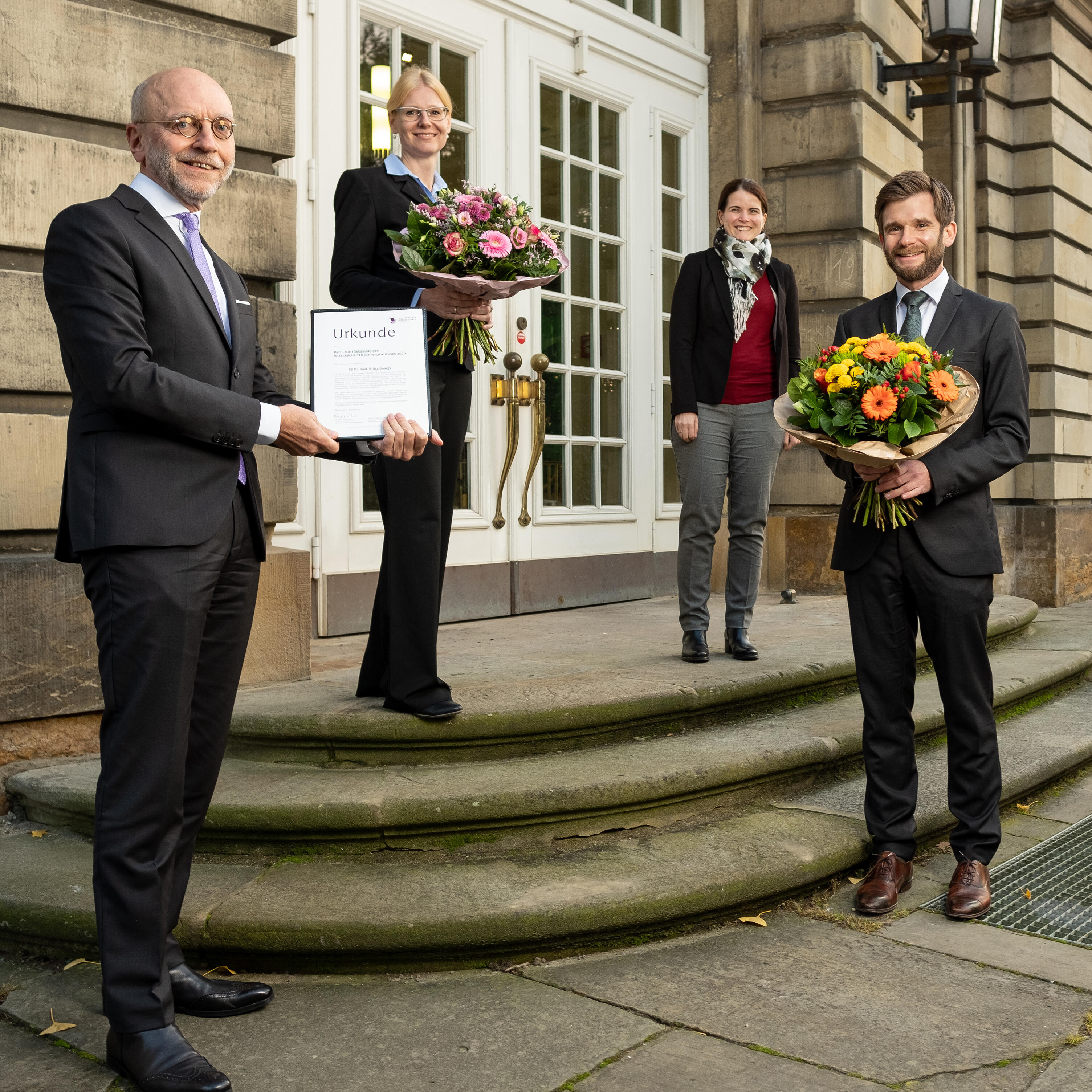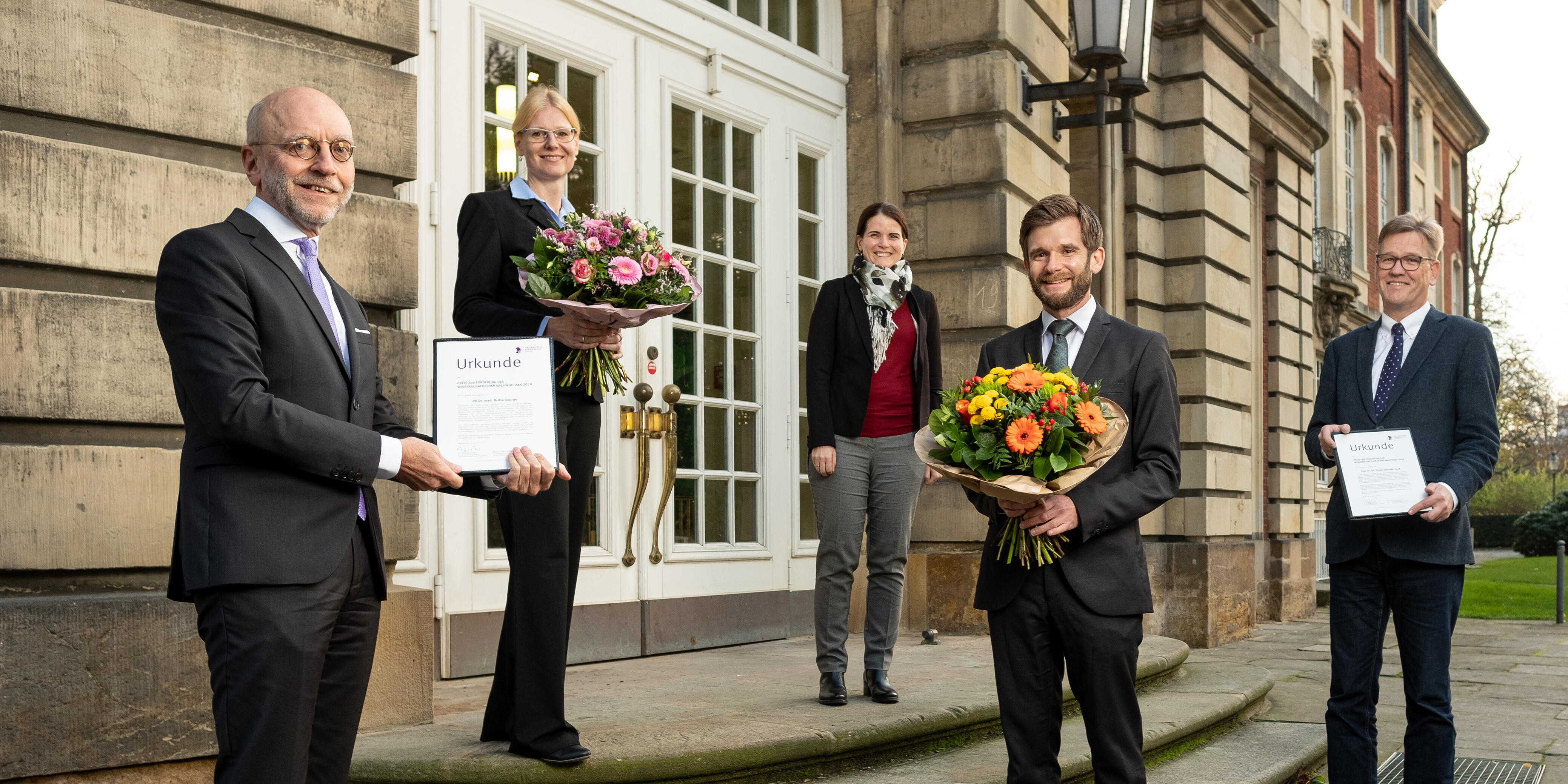 Für ihre herausragende Forschung hat die Universitätsgesellschaft Münster der Medizinerin PD Dr. Britta George und dem Rechtswissenschaftler Prof. Dr. Tristan Barczak den Nachwuchsförderpreis 2020 verliehen. „Sie haben beide in schwierigen Zeiten Außergewöhnliches geleistet – und deswegen ist es uns eine Freude und Ehre, Sie mit diesem Preis unterstützen und auszeichnen zu dürfen“, betonte der Vorstandsvorsitzende der Universitätsgesellschaft, Dr. Paul-Josef Patt.