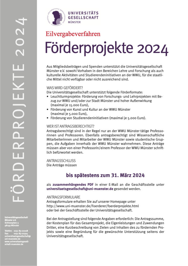 Die Anträge müssen im Eilvergabeverfahren bis spätestens zum 31.03.2024 als zusammenhängendes PDF in einer E-Mail an die Geschäftsstelle unter universitaetsgesellschaft@uni-muenster.de gesendet werden.