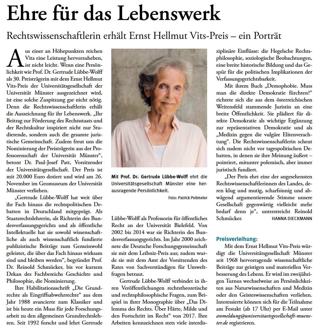 Ernst Hellmut Vits-Preis an Bundesverfassungsrichterin a. D. Prof. Dr. Dr. h.c. Gertrude Lübbe-Wolff L. L. M. verliehen