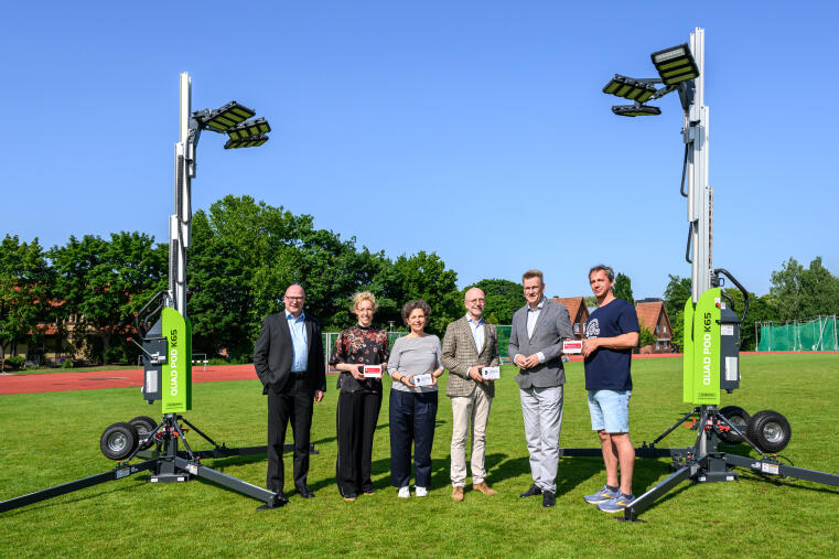 Mehr Licht auf dem Sportcampus Universitätsgesellschaft Münster und Sparkasse Münsterland Ost übergeben mobile Flutlichtanlagen an den Hochschulsport
