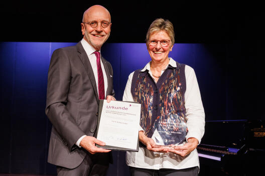 Frau Dr. Balbach erhält die Urkunde und die Trophäe des Wissenschaftskommunikationspreis© UG_Peter Leßmann