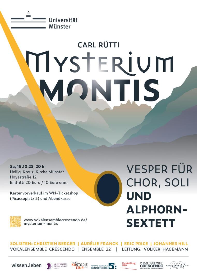 Am 18. Oktober 2025 wird Münster zum Schauplatz einer außergewöhnlichen Deutschlandpremiere: Das Ensemble 22 der Universität Münster und das Vokalensemble Crescendo bringen unter der Leitung von Volker Hagemann das Werk Mysterium Montis des Schweizer Komponisten Carl Rütti erstmals nach Deutschland und damit in unsere Region.