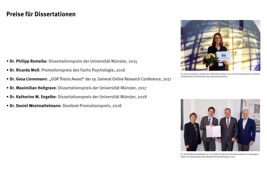 Dissertation prizes and awards document the professional recognition of the scientific achievements. The interdisciplinary work in the Research Training Group – in which researchers from Communication, Psychology, Sport and Exercise Sciences, Business and Economics and Information Systems worked collaboratively – was always a great challenge. However, it contributed significantly to broadening disciplinary perspectives and creating a win-win situation.