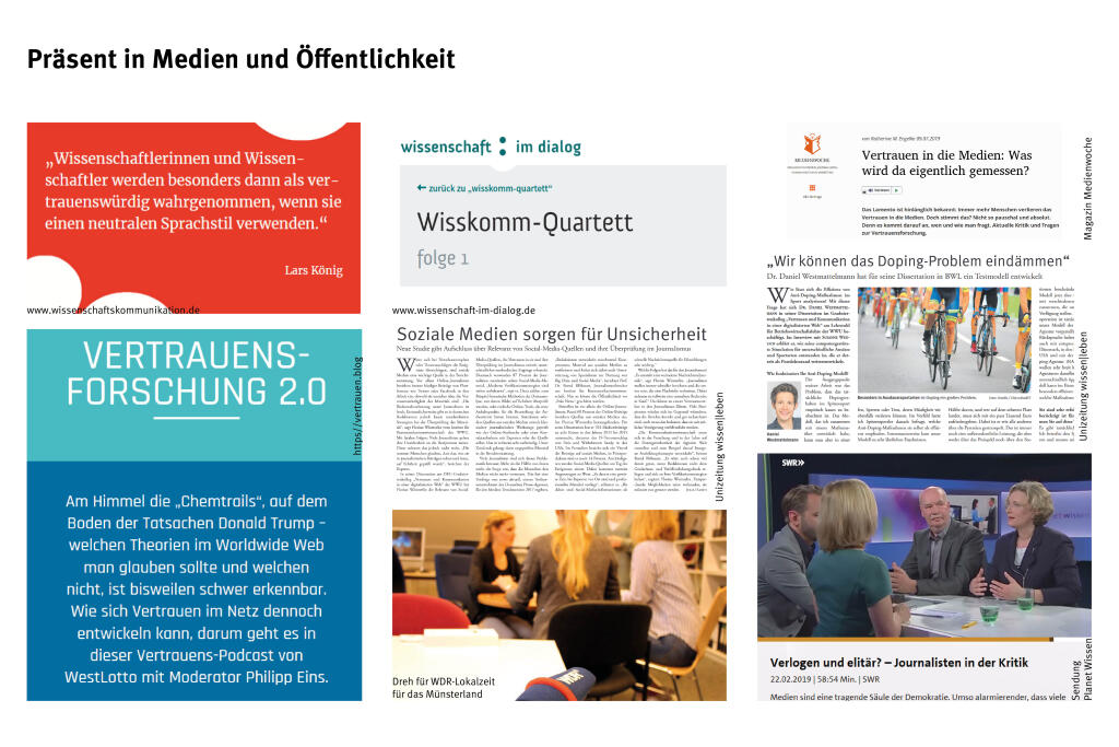 The Research Training Group “Trust and Communication in a Digitized World”, funded by the German Research Foundation (DFG), has accompanied this process since 2012. The researchers involved have investigated how trust may be established, developed and maintained under digital conditions in the fields of economy, sports, science and the media. The research projects dealt with theoretical and conceptual principles of trust and mistrust research as well as specific application areas of trust communication and methodological problems of research. In addition to the numerous scientific publications and conference contributions, the Research Training Group has also worked intensively on disseminating its findings outside the scientific communities. Results were presented in an exhibition as well as in schools, academies and at workshops. Broadcast, print and digital media have reported on the research.