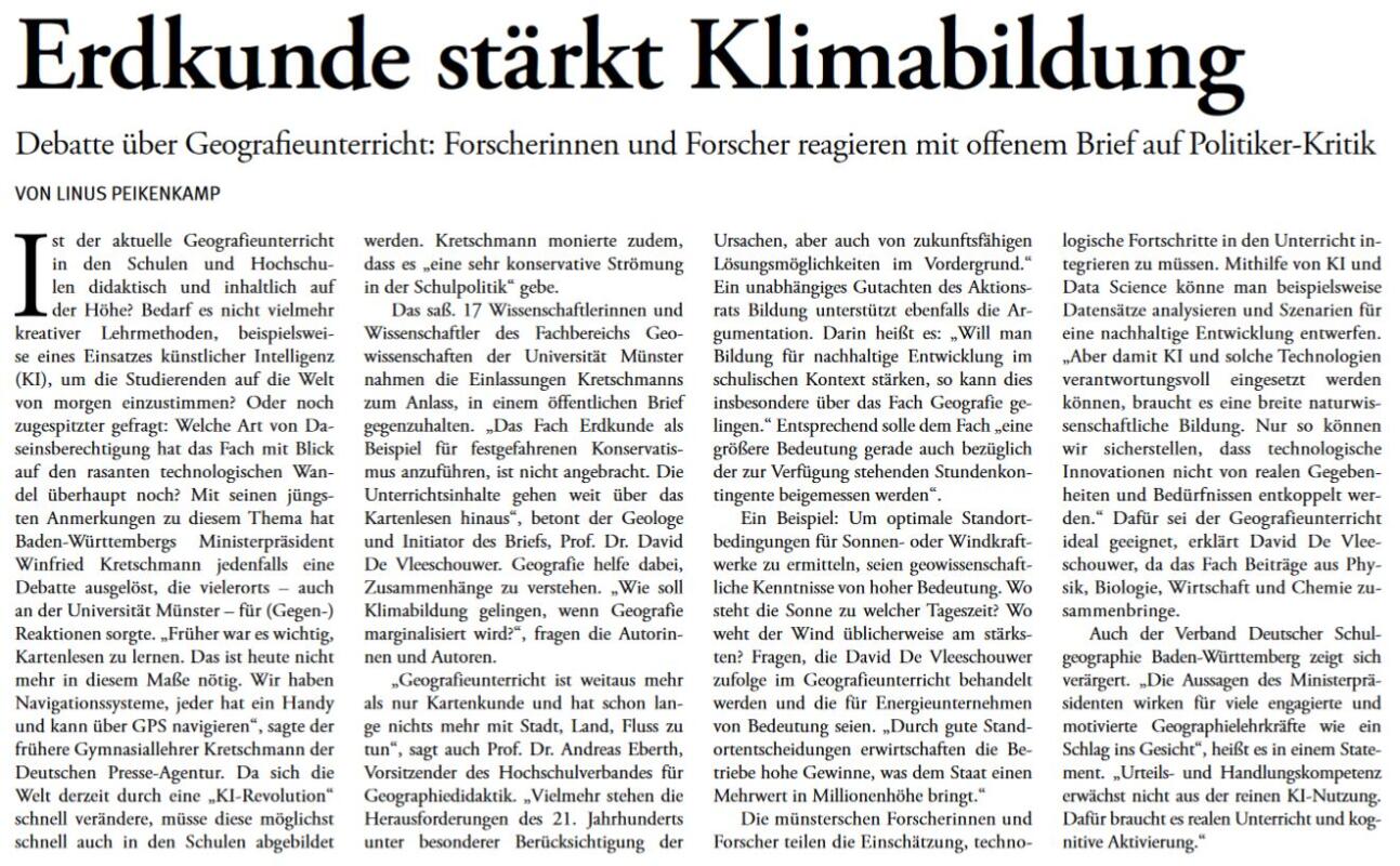 Die Zeitung der Universität Münster „wissen | leben“ berichtet in ihrer neuen Ausgabe (Link) über die hohe Relevanz des Schulfachs Erdkunde für die Klimabildung. Dies ist Reaktion auf die Äußerungen des baden-württembergischen Ministerpräsident Winfried Kretschmann (Link), die zeigen, wie wenig Kenntnisse dieser in Bezug auf die Inhalte eines modernen Erdkundeunterrichts hat.