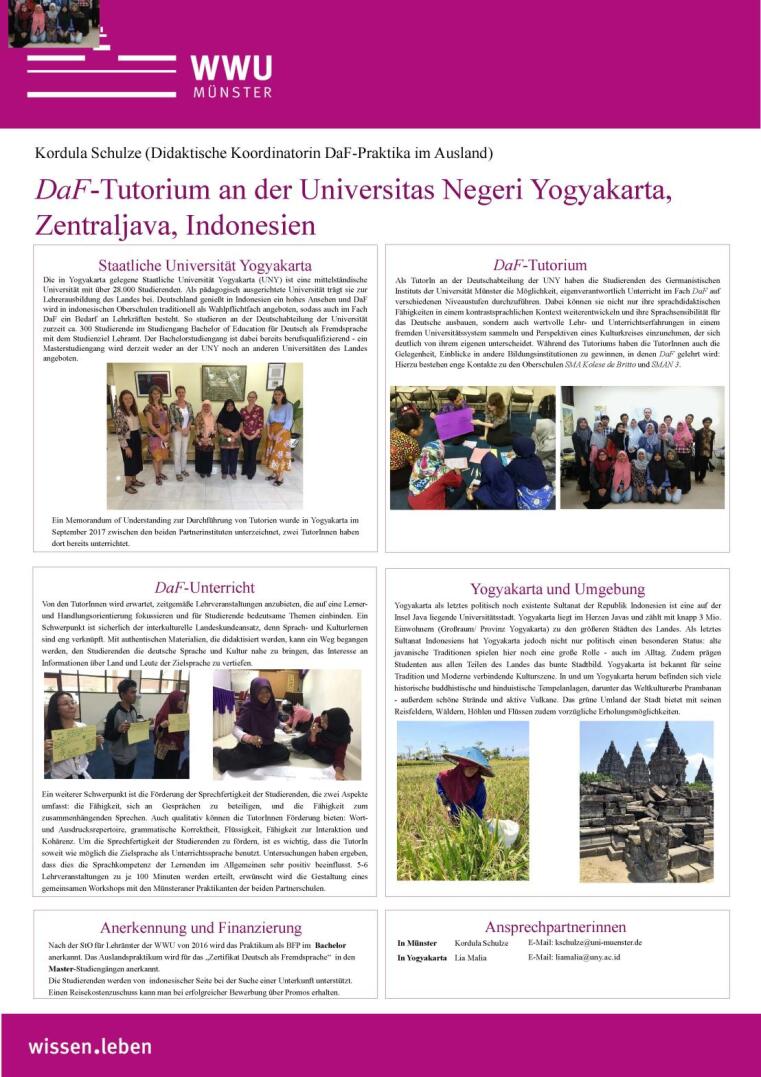 Praktikumsvorbereitung und -betreuung: In der Vorbereitung wird der Besuch eines praktikumsvorbereitenden Seminars "Sprachlehrpraxis" (2 SWS) mit dazu gehörigen Hospitationseinheiten am Sprachenzentrum der Universität Münster vorausgesetzt. Vor und während des Praktikums werden die teilnehmeden Tutor*innen von der Praktikumskoordination vor Ort betreut.