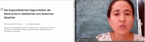 Das Promotionsprojekt „Die linguistischen Eigenschaften der Metonymie in der usbekischen und deutschen Sprache“ von Chamangul Yusubova (Staatliche Universität Urgench) untersucht die Bedeutung und Funktion metonymischer Ausdrucksweisen im Sprachvergleich. Im Mittelpunkt stehen dabei Namensbezeichnungen, die Beziehung zwischen Wort und Bild sowie die semantische Bedeutungsübertragung in verschiedenen Sprachen, insbesondere im Usbekischen und Deutschen. Chamangul Yusubova entwickelte dafür eine Typologie der Metonymie, die systematisch verschiedene Formen und Funktionen dieses sprachlichen Phänomens klassifiziert. Für die Analyse des Deutschen greift sie unter anderem auf literarische Texte zurück und verwendet als Grundlage „Das Jahr des Skorpions“ von Ingeborg Baldauf.