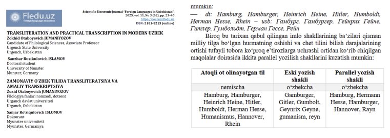 Die Zusammenarbeit der beiden usbekischen Wissenschaftler führte zu einer fundierten Analyse der Herausforderungen und Verfahren bei der Transliteration und Transkription usbekischer Eigennamen in Fremdsprachen, insbesondere ins Englische und Deutsche, sowie umgekehrt. Ein zentrales Augenmerk liegt auf der Problematik einzelner usbekischer Buchstaben, für die bislang keine einheitlichen Übertragungsregeln existieren. Der Einfluss der russischen Sprache und kyrillischer Transliterationstraditionen auf amtliche Schreibweisen wird kritisch beleuchtet. Die Autor*innen zeigen die Notwendigkeit einer modernen, international anschlussfähigen Standardisierung auf und sprechen sich für die Orientierung an bestehenden Normen wie ISO 9:1995 und ALA-LC aus. Neben theoretischen Aspekten enthält der Beitrag auch eine Analyse der praktischen Transkriptionspraxis in usbekischen und deutschen Massenmedien. Dabei wird der aktuelle Stand der Sprachverwendung dokumentiert und konkrete Vorschläge zur Vereinheitlichung unterbreitet. Der Artikel verbindet damit sprachwissenschaftliche Reflexion mit praxisnahen Empfehlungen für Wissenschaft, Öffentlichkeit und sprachpolitische Gremien. Insgesamt liefert er eine fundierte Grundlage für die weitere Diskussion über Normierung und Sprachpflege im internationalen Kontext.