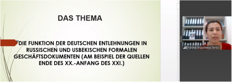 Ziel des Promotionsprojekts von Fotima Ergasheva (Staatliche Universität Termez) ist die Untersuchung der Funktion deutscher Entlehnungen in formalen Geschäftsdokumenten des Russischen und Usbekischen. Im Fokus stehen dabei etymologische, semantische, phonetische und graphematische Aspekte dieser Entlehnungen. Zudem werden drei Ausgaben usbekischer Wörterbücher vergleichend analysiert, um den historischen Wandel und die Integration deutscher Lehnwörter zu dokumentieren. Auf diese Weise soll ein umfassender Einblick in die sprachliche Adaption und den funktionalen Einsatz deutscher Lehnwörter in beiden Sprachsystemen gewonnen werden.