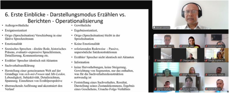 Am 27. Juni fand das zweite Kolloquium für angehende usbekische Wissenschaftler:innen statt. Die Veranstaltungsreihe bietet eine Plattform für die Präsentation und gemeinsame wissenschaftliche Reflexion aktueller Promotionsvorhaben in den Germanistik-Abteilungen der Partneruniversitäten in Usbekistan.