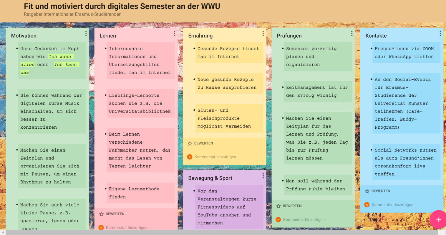 © Germanistisches Institut Max von Mulert, Master-Student der hiesigen Universität, führte die Studierenden durch die Innenstadt und durch ausgewählte Uni-Gebäude wie das Schloss. All dies geschah in Anbindung an das Germanistische Institut insbesondere unter dem Gesichtspunkt von öffentlicher Text- und Literatur-Begegnung. Besonders im Fokus stand die Auseinandersetzung mit Lyrik und dem Potential von „öffentlichen“ Gedichten. So schaffte der Workshop nicht nur eine neue Perspektive auf die Stadt Münster und ihre Geschichte, sondern auch eine neue Aufmerksamkeit für verschiedene unkonventionelle Medien im Stadtbild und die Ästhetik von Alltäglichem. Die Teilnehmenden waren im Anschluss dazu eingeladen, in der Atmosphäre des Schlossgartens bei einem Picknick selbst kreativ zu werden und poetisch über die Umgebung und die eigene Auslandserfahrung nachzudenken. So bot der Workshop nicht nur eine Plattform des literarischen und fachlichen Austausches, sondern auch ein lockeres Vernetzen der Studierenden.