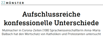 Im Interview mit dem Journalisten und Dipl.-Theologen Gerd Felder berichtet Anna-Maria Balbach über Veränderungen der katholischen und evangelischen Radiobeiträge unter dem Einfluss der Pandemie. Neben den wissenschaftlichen Ergebnissen interessierte sich der Journalist auch für die beruflichen und persönlichen Veränderungen im Leben der Sprachwissenschaftlerin Balbach durch die Coronakrise. Das Interview ist am 9. Oktober 2022 in der evangelischen Zeitung „Unsere Kirche Nr. 41“ erschienen, die wöchentlich von 130.000 Menschen gelesen wird.