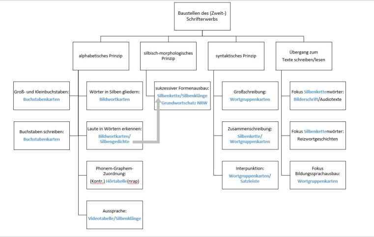Die Instrumente Hörtabelle, Videotabelle, Silbenkette und Satzleistelight machen Schrift- und Sprachstrukturen für den Orthographieerwerb zugänglich. Sie werden durch weitere Materialien ergänzt. Die Silbengedichte wurden entwickelt, um laut- und silbenbezogene Vermittlungsansätze zu vereinen. Das Silbenkettenbilderbuch Silbenklänge dient der Aussprachetestung, dem Vergleichen von Silbenklängen sowie der Reflexion über silbische und morphologische Schreibungen.