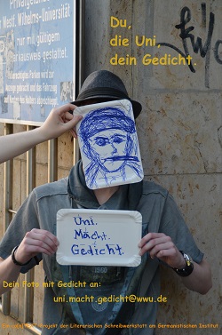 Die Literarische Schreibwerkstatt am Germanistischen Institut lädt alle Studierenden und Lehrenden zu einer Foto- und Plakataktion unter dem Titel „Uni.Macht.Gedicht.“ ein. Einen Impuls für ein Foto mit Gedicht liefert das angehängte Plakat. Für die Gedichte gibt es keinerlei formale Vorgaben. Die Fotos werden nach und nach auf Plakaten im Germanistischen Institut veröffentlicht.
