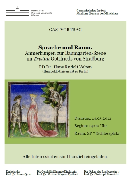 Gastvortrag von PD Dr. Hans Rudolf Velten (Humboldt-Universität zu Berlin) zum Thema: Sprache und Raum. Anmerkungen zur Baumgarten-Szene im Tristan Gottfrieds von Straßburg.