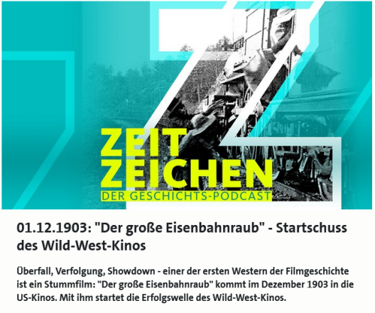 Das "ZeitZeichen" nimmt Edwin S. Porters "The Great Train Robbery" (1903) in Augenschein. Es geht um das Western-Genre, Erzählformen des Frühen Films und Einflüsse auf die Filmgeschichte. Ich war als Interviewpartner geladen.