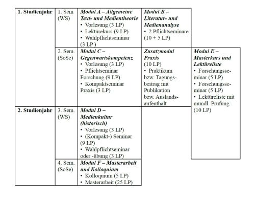 - Voraussetzung für den Zugang zum Masterstudiengang Kulturpoetik der Literatur und Medien ist neben den allgemeinen Voraussetzungen für die Einschreibung die Absolvierung eines fachlich einschlägigen Studiums aus dem Bereich der Philologien bzw. der Geistes- und Kulturwissenschaften mit einer Regelstudienzeit von mindestens sechs Semestern, das mit einem Bachelor oder einem anderen berufsqualifizierenden Abschluss (Magister, Staatsexamen, Diplom etc.) erfolgreich beendet worden ist. Fachlich einschlägig ist ein Studium, wenn es eine für den Masterstudiengang Kulturpoetik der Literatur und Medien relevante Philologie als eines der Bachelorfächer enthält. In der Regel sind dies Komparatistik (Allgemeine und Vergleichende Literaturwissenschaft), Germanistik, Anglistik, Romanistik, Slavistik, Niederlandistik, Skandinavistik, Klassische Philologie und im engeren Sinn vergleichbare oder zum Masterstudiengang Kulturpoetik der Literatur und Medien affine geisteswissenschaftliche Studiengänge, deren Eignung als Vorqualifikation im Einzelfall durch die Auswahlkommission festzustellen ist.