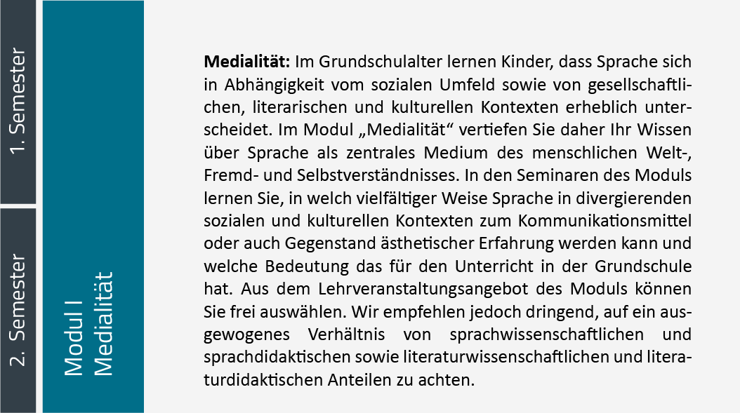 Im Modul „Medialität – Sprache, Literatur und Kunst im gesellschaftlichen und kulturellen Umfeld“ steht die Sprache als zentrales Medium des menschlichen Welt-, Fremd- und Selbstverständnisses im Mittelpunkt. In den Seminaren des Moduls vertiefen Sie Ihr Wissen in Themenfeldern wie sprachliche Heterogenität oder sprachliches Handeln und reflektieren Sie den Einsatz von Literatur und Medien im Grundschulunterricht. Im fakultativen Projektmodul haben Sie darüber hinaus die Möglichkeit künstlerisch-kreative oder schulpraktische Projekte zu entwickeln, durchzuführen und zu reflektieren.