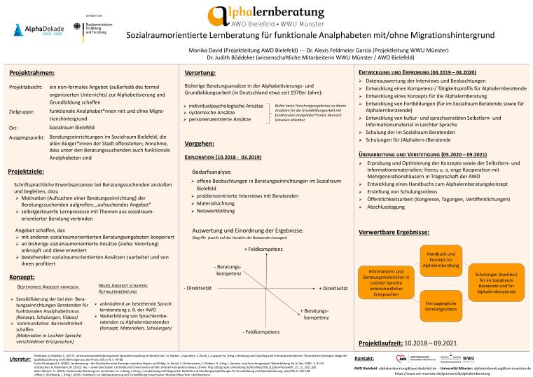 Poster zum Projektvorhaben, wie es auf einer Kick-Off-Veranstaltung einiger Projekte aus dem Bereich Lebensweltorientierte Grundbildung der AlphaDekade gezeigt wurde (Dezember 2018)