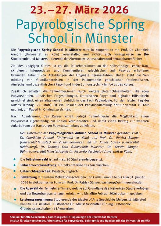 Das Seminar für Alte Geschichte heißt Niklot Lingnau herzlich willkommen. Er hat in Heidelberg studiert (Bachelor of Arts: Alte Geschichte und Latinistik; Master of Arts: Alte Geschichte) und sich in seiner Masterarbeit mit der Entwicklung des Strategenamtes in hellenistischer Zeit im Lichte neuer Papyrusfunde beschäftigt. Herr Lingnau wird als wiss. Mitarbeiter im FOR Xenokratie tätig sein und gleichzeitig die Forschungsstelle Papyrologie verstärken.