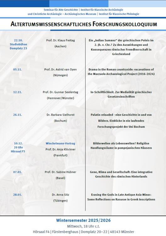 Ein solches, mithin radikales Bekenntnis zu Wandel und Weiterentwicklung verlangt nach viel Kompromissfähigkeit. Es ist kein Zufall, dass Gesetze wie dasjenige aus Dreros oft als genuiner Beginn einer politischen Kompromisskultur in der Antike verstanden werden. Unser Seminar ist so besehen besonders gut aufgestellt, einen zentralen Beitrag zu einem neu aufgelegten Verbundforschungsprojekt „Kulturen des Kompromisses“ zu leisten, das an den Universitäten Münster und Duisburg-Essen angesiedelt ist. In der maßgeblich auch aus der Alten Geschichte betriebenen Forschungscloud „Lokalismus und lokaler Raum“ des Exzellenzclusters spüren Forscherinnen und Forscher die lokale Einhegung von politischen Diskursen auf, auch aus dem lebendigen Befund der Inschriften und Papyri. Und in der Forschungsreihe Epichorios gehen wir an unserem Seminar den Fragen nach den umweltlichen und ökokritischen Interdependenzen nach, die jede Form von politischer Kommunikation in eigene Bahnen lenken.