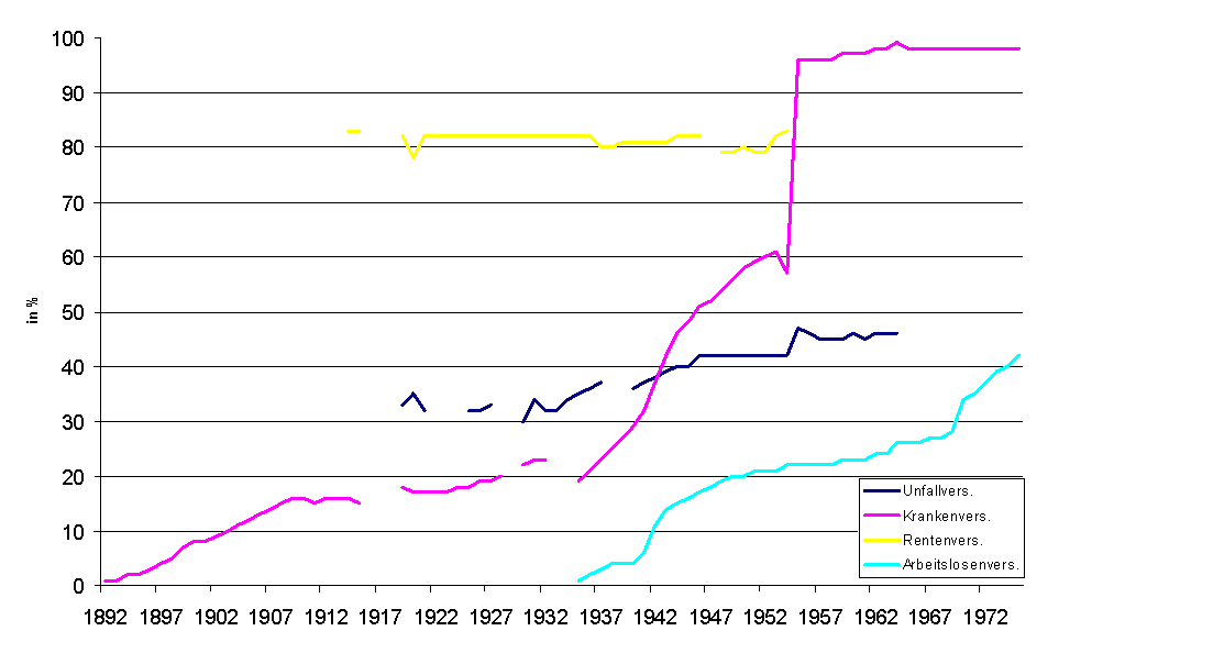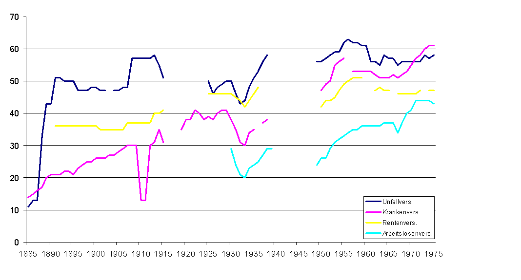Kommentar: Der Abdeckungsgrad in Deutschland hat sich allmählich, mit Schüben in den 1930er und 1950er Jahren erhöht. Das Niveau bleibt auch danach im europäischen Vergleich niedrig, was die enge Verbindung der Sozialversicherung an den (männlichen) Erwerbsstatus reflektiert.
