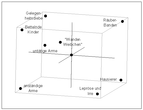 Abweichungen in der Dimension Unvermögen waagerecht ("Lepröse und Irre", die durch Krankheit, nicht primär aus materiellen Gründen zur Randgruppe werden) und solche in der Dimension Nähe in die Tiefe abgetragen ("Hausierer").