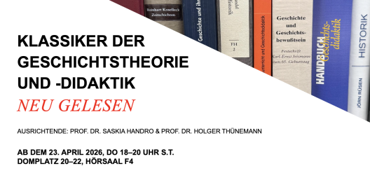 Die Vortragsreihe startet im SoSe 2026 und wird im WiSe 2026/27 fortgesetzt. Sie richtet sich an ein interessiertes Fachpublikum, Lehrende sowie fortgeschrittene Studierende des Lehramts Geschichte und der Geschichtswissenschaft.