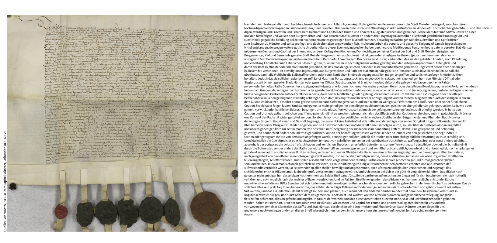 Bei der obenstehenden Quelle handelt es sich um einen Vertrag, der zwischen dem Rat der Stadt Münster und den Vertretern der Münsteraner Geistlichkeit am 13. August 1558 geschlossen wurde und der die Ausdifferenzierung gerichtlicher Kompetenzen festschrieb. Der Vertrag bestimmt, dass der Rat der Stadt Münster unter bestimmten Bedingungen geistliche Personen festnehmen durfte. Dieses Recht wurde allerdings auf solche Fälle beschränkt, in denen ein Kleriker ein mit der Todesstrafe belegtes Verbrechen verübt oder des Ehebruchs überführt worden war. Der Stadtrat durfte die geistliche Person dann festnehmen und festsetzen, allerdings nicht selbst bestrafen. Dafür musste er sie an den Fürstbischof ausliefern, damit dieser als Landesherr und geistliches Oberhaupt des Stiftsklerus Recht sprechen konnte.