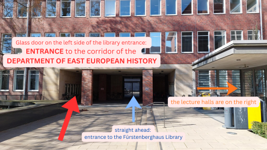 Approach the entrance of the Library of the History Department and enter the Fürstenberghaus through the door on the left. The department is located on the ground floor, behind the glass door on the right-hand side of the corridor.