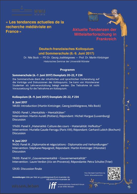 In diesem Sommersemester findet die Veranstaltung "La jeune génération des médiévistes français invitée à Münster" im Rahmen einer Blockveranstaltung statt und besteht aus einer Sommerschule sowie einem Kolloquium.