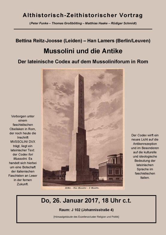 Das Seminar für Alte Geschichte/Institut für Epigraphik lädt Studierende und Interessierte herzlich zum Vortrag "Mussolini und die Antike. Der lateinische Codex auf dem Mussoliniforum in Rom" von Bettina Reitz-Joosse (Leiden) und Han Lamers (Berlin/Leuven) ein.